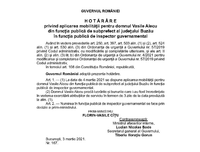 Decizia a fost publicată în Monitorul Oficial iar Vasile Alecu are la dispoziție trei zile, începând de joi, pentru a preda lucrările și bunurile care i-au fost încredințate succesorului pe post sau unui superior care nu a fost, încă, numit. Tot în cursul zilei de miercuri ar putea fi desemnați, prin Hotărâre de Guvern prefectul și cei doi subprefecți ai județului Buzău. După desemnare cei trei vor trebui să depună jurământul de credință, cal mai probabil, în cadrul unei ceremonii online.